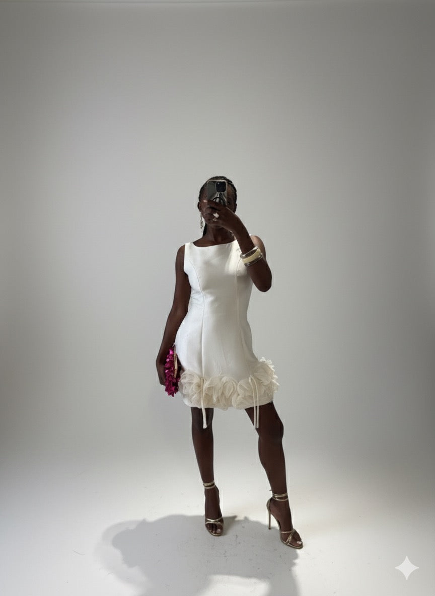 Radiate timeless elegance in the Ivory Rosette Mini, a masterpiece of refined femininity. Crafted from smooth ivory satin, this sculpted mini dress features a flattering tailored silhouette that contours gracefully to the body. The hem is adorned with ethereal organza rosettes, evoking the delicate beauty of blooming lilies in motion.