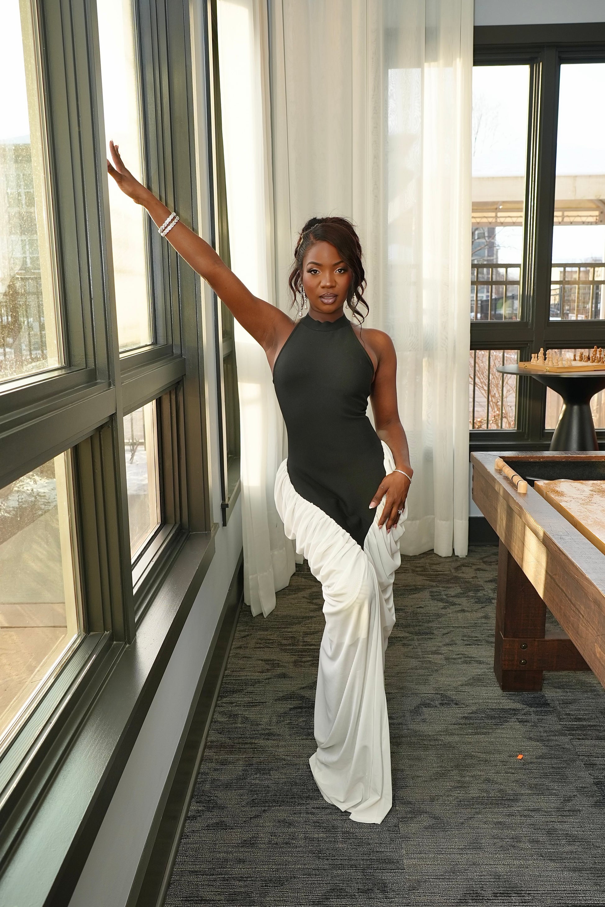 is a striking fusion of modern elegance and timeless glamour. Designed to sculpt and flatter, this floor-length silhouette features a sleek, form-fitting black bodice that flows effortlessly into a dramatic ivory draped skirt, creating a bold yet refined contrast. The high neckline and sleeveless cut exude confidence, while the soft cascading fabric adds movement and romance with every step.